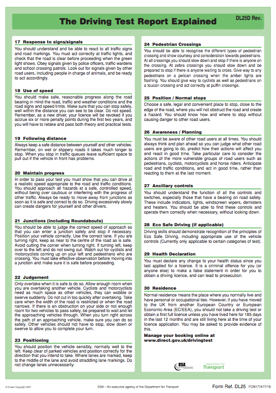 Your test is marked on the form below and further down this page are explainers to how your test will be marked. This provides a good insight to what the examiner is looking for. (please note not all sections will be used for your category B CAR driving test)